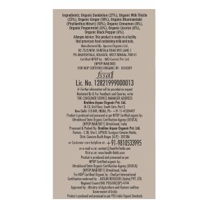 organic dandelion (27%), organic milk thistle (23%), organic ginger (18%), organic bhumiamlaki (10%), organic cinnamon (8%), organic peppermint (6%), organic licorice (4%), organic black pepper (4%)