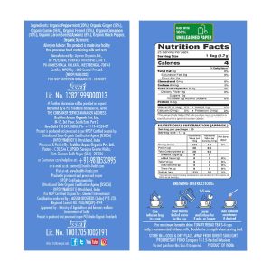 organic peppermint (20%), organic ginger (18%), organic cumin (16%), organic fennel (13%), organic cinnamon (10%), organic carom seeds (8%), organic black pepper, organic turmeric